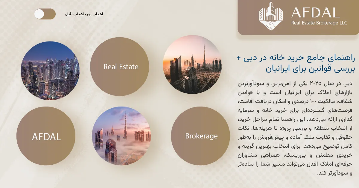 بازار املاک دبی در سال ۲۰۲۵ یکی از شفافترین و جذابترین فرصتهای سرمایهگذاری برای ایرانیان است. در این راهنما تمام بخشهای مهم خرید خانه در دبی را از تعیین هدف و بودجه، انتخاب منطقه، بررسی پروژهها، تفاوت ملک آماده و پیشفروش، هزینههای قانونی، مراحل دریافت سند، شرایط اقامت و اشتباهات رایج سرمایهگذاران بررسی کردیم تا مسیر خرید برای شما روشن و قابل تصمیمگیری باشد.