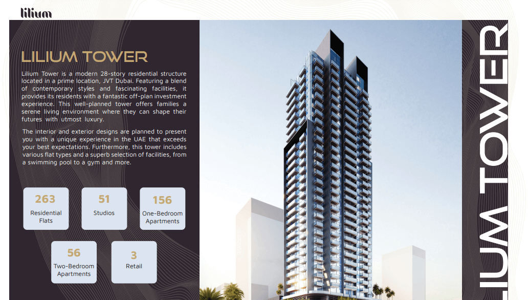 پروژه LILIUM (لیلیوم) از سازنده شناختهشده TIGER Properties در قلب محله محبوب Jumeirah Village Triangle (JVT) واقع شده است؛ محلهای خانوادگی، آرام و سرسبز که در عین حال، دسترسی بسیار خوبی به محورهای اصلی و مناطق مهم دبی دارد.